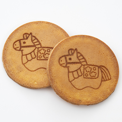 午(うま)の焼き印を施した、小倉山荘オリジナル柄のたまごせんべいです。